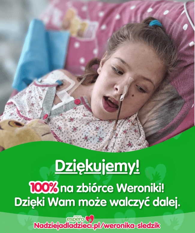 Po kilkunastu miesiącach walki, łez i niepewności… stał się cud. Zbiórka dla Weroniki osiągnęła 100%! 🎉 Weronika i jej babcia, pani Jadwiga, z całego serca dziękują każdej osobie, która podała im pomocną dłoń. 💕 To dzięki Wam Weronika ma szansę na leczenie, na życie, na dzieciństwo, którego tak bardzo potrzebuje. Pani Jadwiga, która tyle razy…