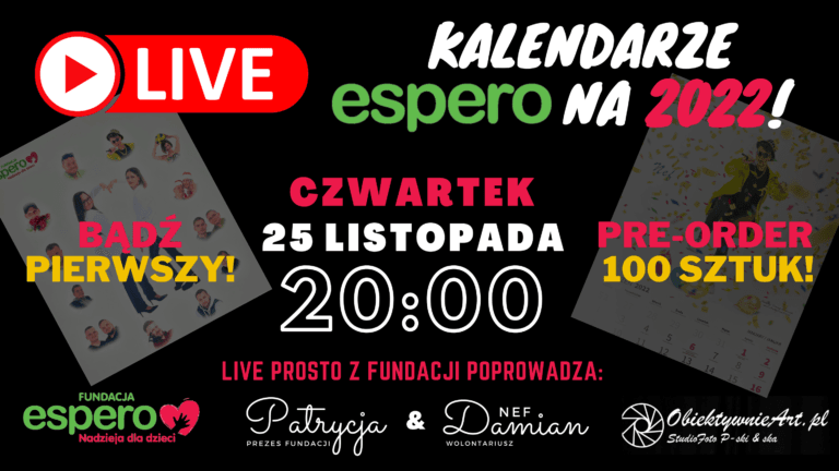 Już wkrótce, bo 25 listopada o godzinie 20:00 rozpocznie się transmisja z siedziby Fundacji Espero – Nadzieja dla Dzieci, gdzie Prezes Fundacji – Patrycja Rudnicka oraz wolontariusz, a także wykonawca muzyki tanecznej Damian „NEF” Krysztofik, poprowadzą dla Was wyjątkowy LIVE. Dlaczego wyjątkowy? Otóż podczas transmisji pierwsze 100 osób będą mogły nabyć kalendarz w cenie promocyjnej,…