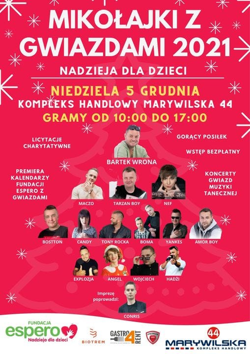 organizowanej przez Fundację Espero – Nadzieja dla Dzieci. Dlatego też zapraszamy Państwa na MIKOKŁAJKI Z GWIAZDAMI 2021. Czeka na Was moc atrakcji! Zagrają : Bartek Wrona , Maczo, Tarzan Boy, Explozja, NEF, Yankes, Zespół BOMA, HADŻI , Tony Rocka, Bostton, @Candy.oficjalny , Formacja Wojciech, AmorBoy-OFFICIAL-music Angel- Agnieszka Jankowska , a imprezę poprowadzi niezawodny Konrad Słomczewski Conris. Zaczynamy już od godziny 10:00 i gramy bez przerwy aż do 17:00! Przy wejściu nr 12! Bądźcie z nami! Podczas imprezy będzie można zjeść ciepły posiłek, nie zabraknie także licytacji charytatywnych, a najważniejszą częścią imprezy będzie premiera plakatów Espero z artystami, (którzy wystąpią na scenie, )dzięki bezinteresowanej pomocy przy zorganizowaniu sesji do kalendarza firmy Obiektywnie.Art! Pamiętajcie, że 100% środków z kwesty trafia do dzieci będących w placówkach szpitalnych!